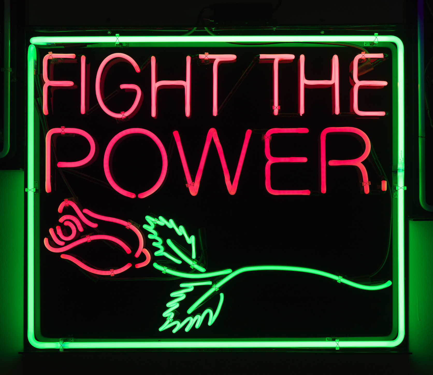From the neon “Fight the Power” sign to an encased Sal’s pizza box prop hanging on the wall and a movie clip of Rosie Perez’s opening scene of Do the Right Thing, where she’s grooving and shaking to Public Enemy’s “Fight the Power”— a song that changed rap music forever with its powerful lyrics and inconvenient social truths that drew legions of fans, including myself, to love the music genre, and cemented the film’s influence not only in Hollywood but in American culture.