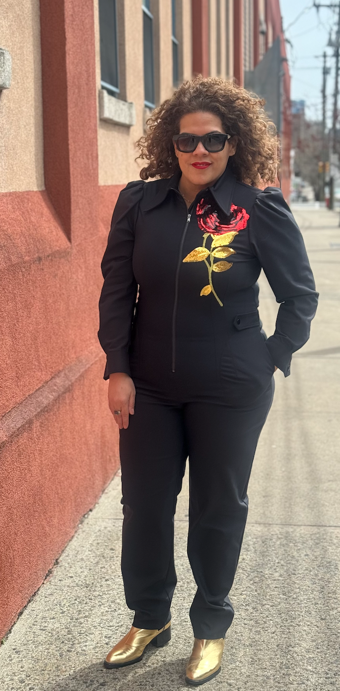 AL: My muse for my first jumpsuit is Virginia Woolf. I named it the Woolf piece. Although she disliked fashion, she moved through life by her own rules, not letting societal conventions dictate her existence. Another inspiration for one of my signature jumpsuits is the Quimby, an homage to Harriet Quimby. She was the first female aviator (not Amelia Earhart) to acquire a pilot’s license and travel across the Atlantic on a plane in a violet flight suit — and the original Quimby is a plum metallic jumpsuit. My pieces reflect the contributions these fascinating outliers made to society. It’s important for me to imbue their stories through design and capture the details.