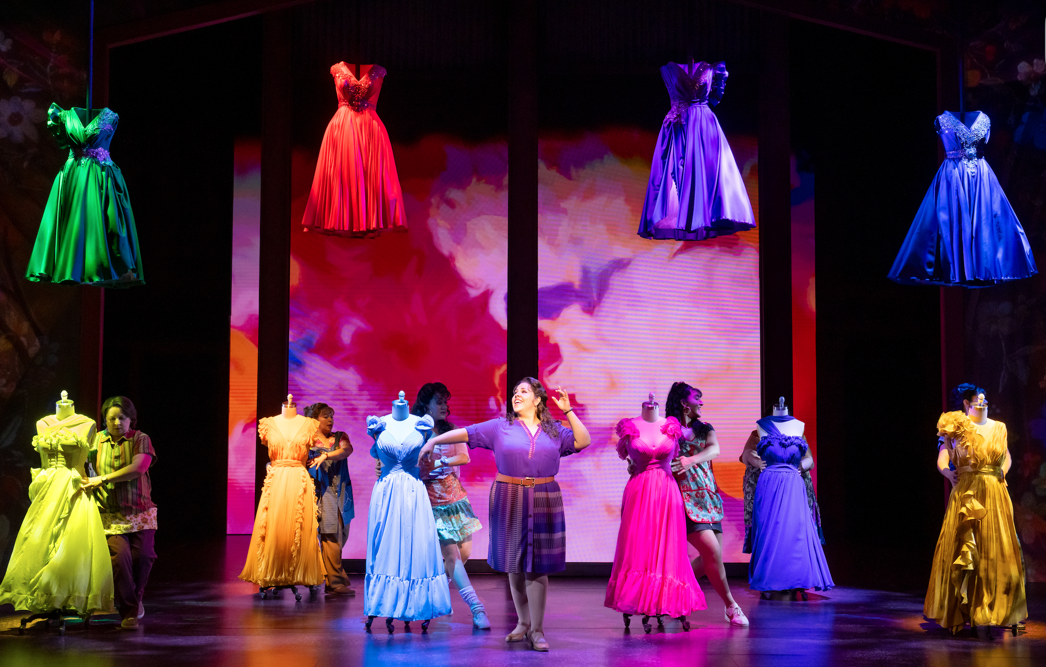 The set design (Arnulfo Maldonado, Buena Vista Social Club) and costumes are rich in warm, Latin American cultural hues, featuring stunning, vibrant dresses that embody the spirit of Mexican Americans.