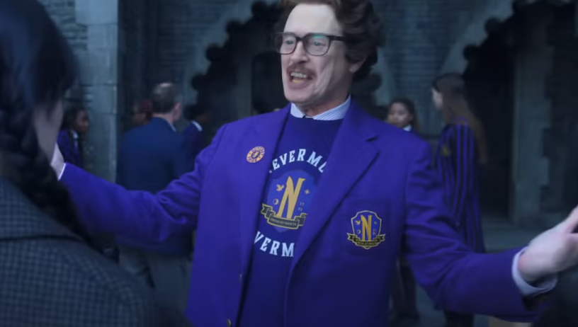 But Wednesday is more than her ancestry; the character is 3-dimensional in that she’s an admirer of literary titans like Voltaire and Sylvia Plath, often quoting them, and laser-focused on taking down the patriarchy while saving the day in a hilarious student camp scene. Wednesday admonishes fitting in, especially when Nevermore’s new enthusiastic principal Barry Dort suggests so, played to perfection by character actor Steve Bucsemi (Fargo, The Sopranos). He’s eccentric, pushy, yet likable with a pyrotechnic ability. He asks Wednesday if she ever suffers from FOMO when not participating in camp activities, to which she replies, “No, I suffer from FOBI (Fear of Being Included) instead.” It’s quintessential Wednesday Addams, and Jenna Ortega nails her character to a tee. Her brother Pugsly has more screen time in season 2, joining his sister at Nevermore and developing his electrokinetic powers. He unearths a buried zombie with an insatiable appetite for brains, whom he keeps as a pet, naming him Slurp. Slurp is grotesque and can’t give up his taste for the mushy matter.