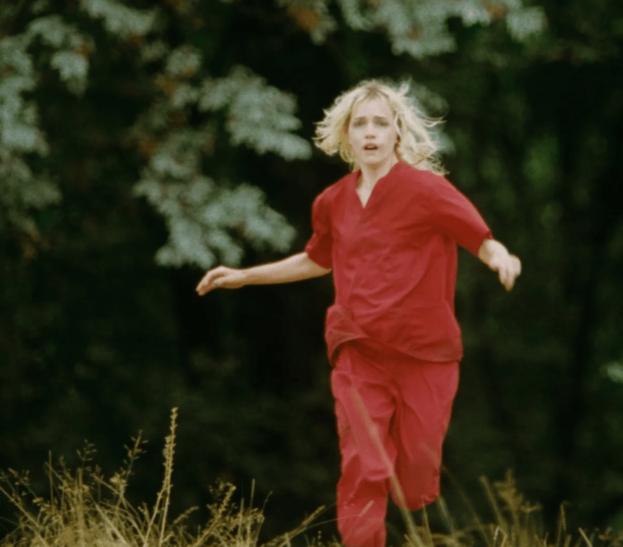 Strange Darling begins with a young woman or “the Lady” as she’s known in the film (Willa Fitzgerald, ReacherThe Fall of the House of Usher) sporting a bandage on her left ear running across a wooded area in a red jumpsuit, clearly distressed. It is a recognizable image, sure, seemingly fitting the horror film trope of the lone woman escaping the deranged killer. And we meet the presumed killer, “the Demon” (Kyle Gallner, SmileDinner in America), soon after chasing the young woman, a modern-looking redneck in a plaid jacket with dirty blonde-haired hair and an almost handlebar mustache carrying a shotgun ready to pounce on his victim, yelling, “Here, Kitty Kitty.”